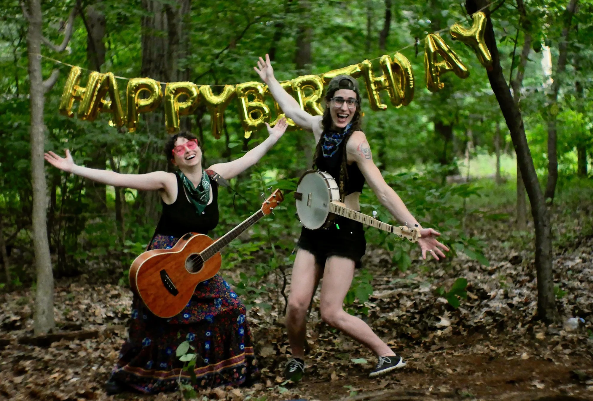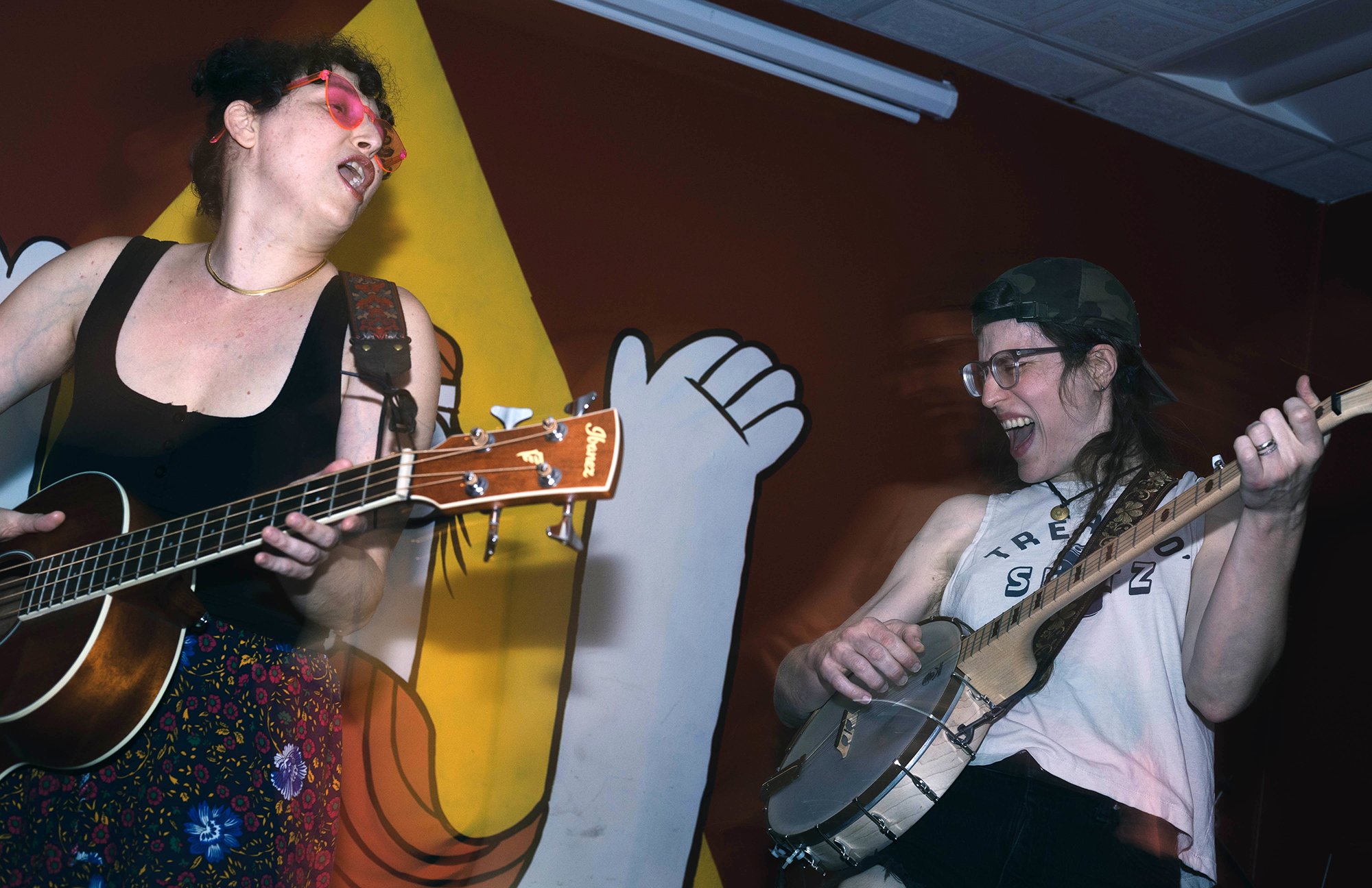 RJ: We play fast, heavy acoustic folk music (primarily banjo and acoustic bass) with influences from punk and metal in a DIY, political social space. Our music and performance of it come directly from our experience as queer femmes, wives, and extremely close collaborative partners.